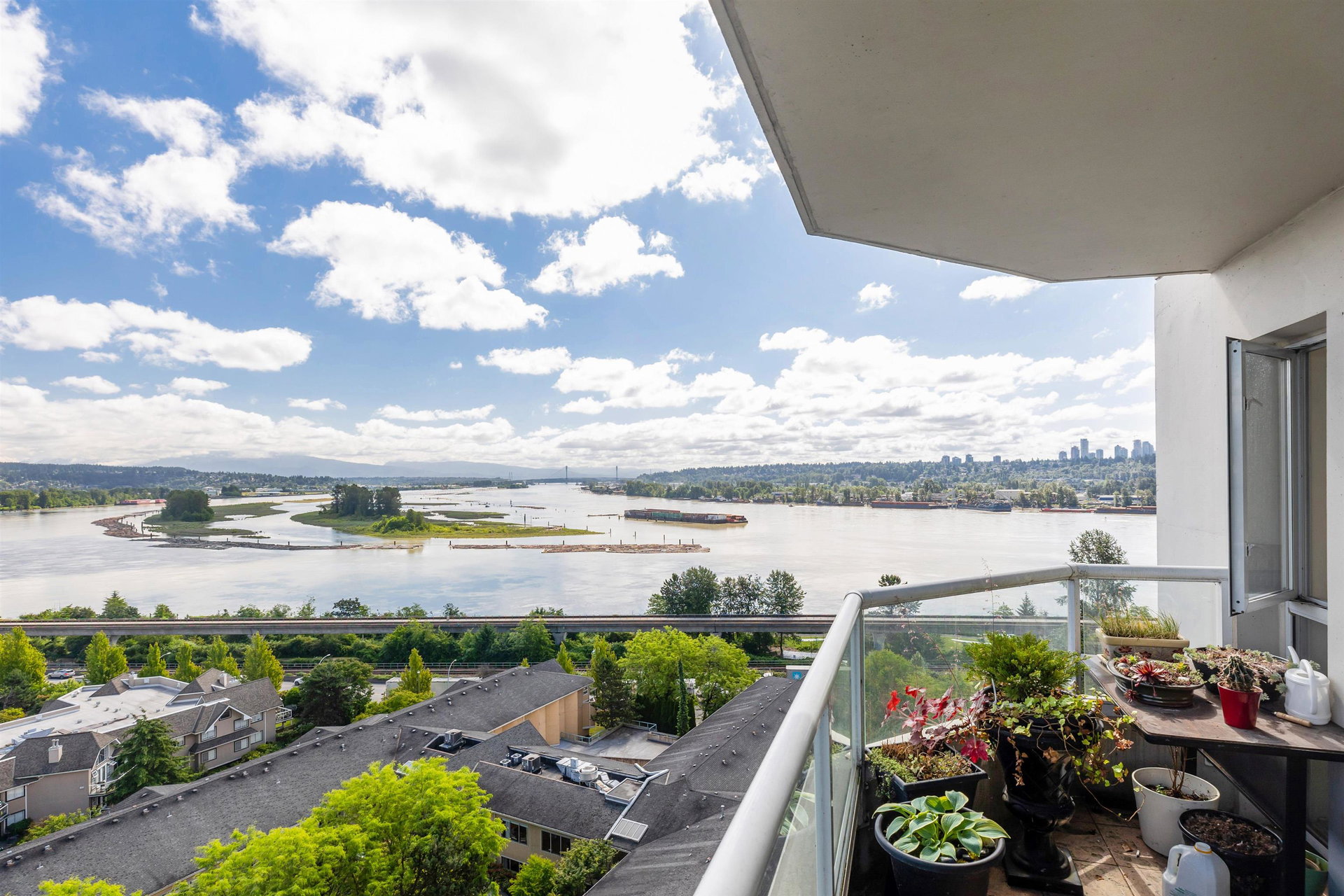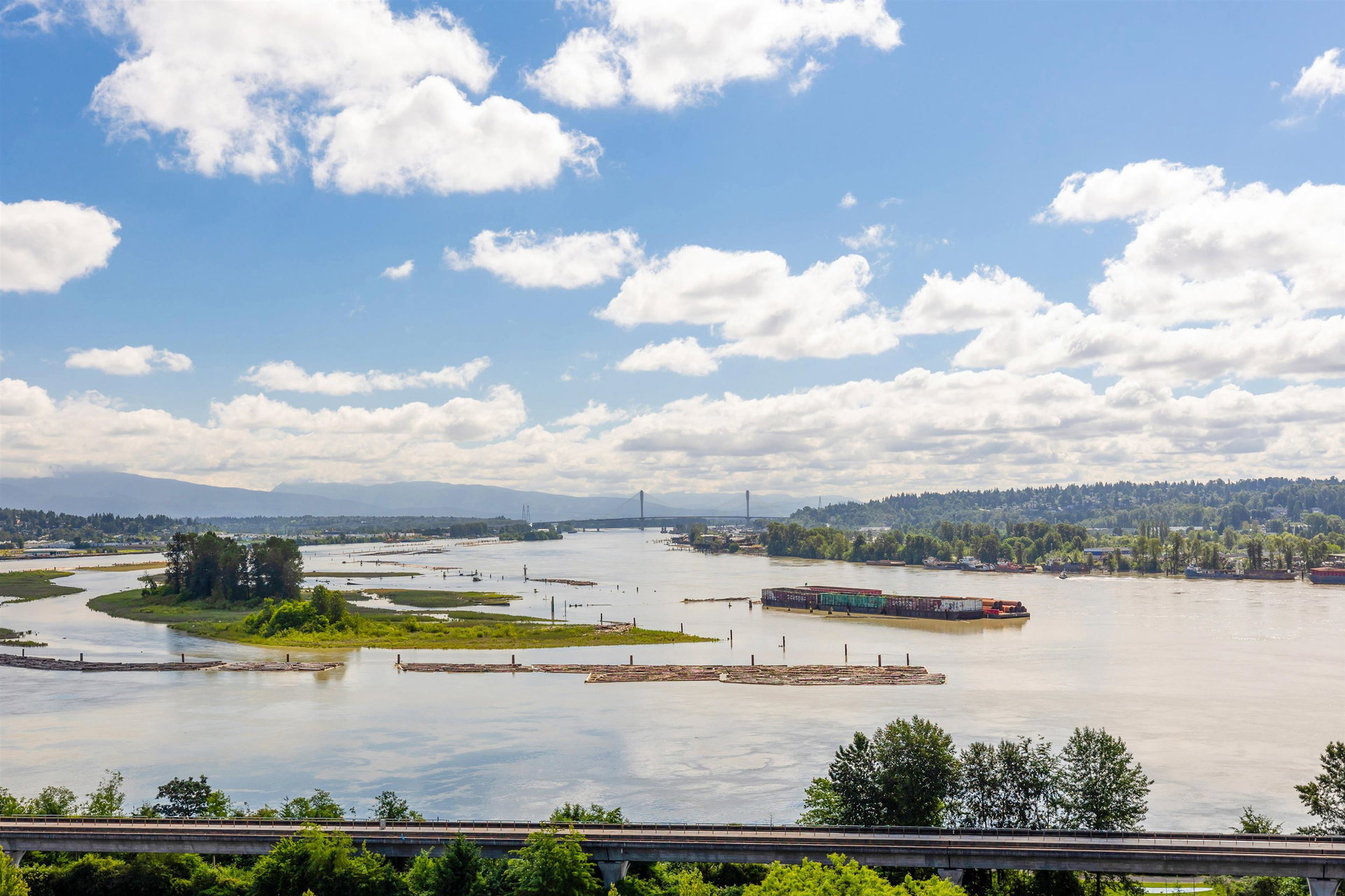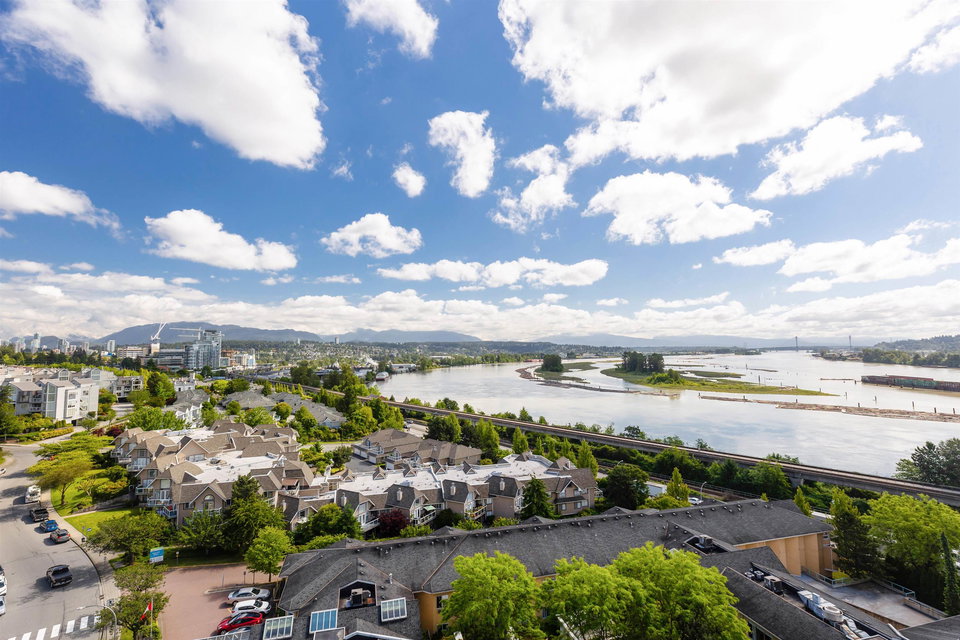 Welcome home to Palace Quay built by Bosa! Amazing corner unit with UNOBSTRUCTED Fraser river and mountain views! This popular ’02 layout feels like a rancher with a spacious and efficient layout. 3rd bedroom has been converted to open den. Building is well maintained & managed with newer roof, plumbing, elevators, paint & hallway upgrades. Fantastic amenities including indoor pool, swirl pool, gym & EV charging!Parking P3- #99; LKR -# 75
