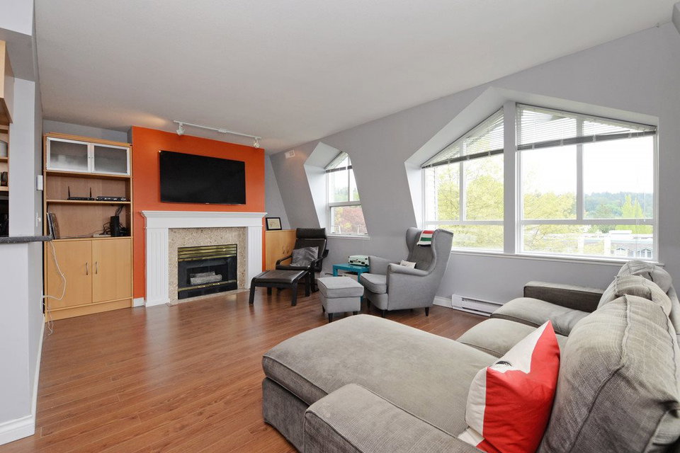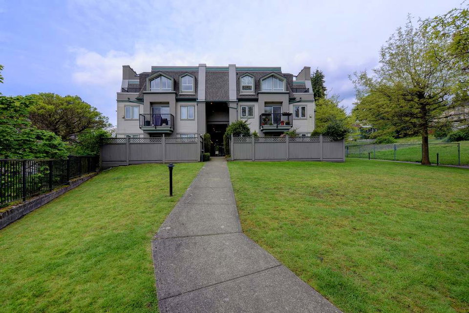Top floor with a view. Private corner unit with only one shared wall sits perched up on the hill with clear sight lines above and beyond the neighbours. 2 large bedrooms, 2 full baths spread across 1,060 sf. Updated kitchen featuring stone counters and maple shaker cabinets. Reliable building: rainscreened, sloped roofs new in 2017. Complete with storage locker & 2 parking stalls.