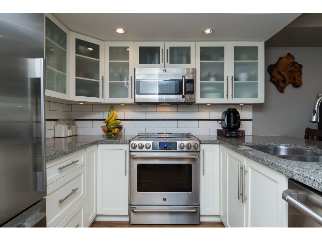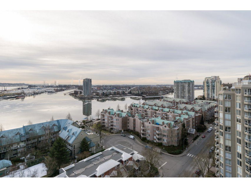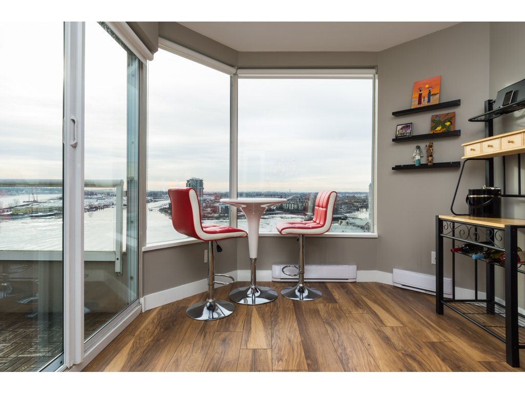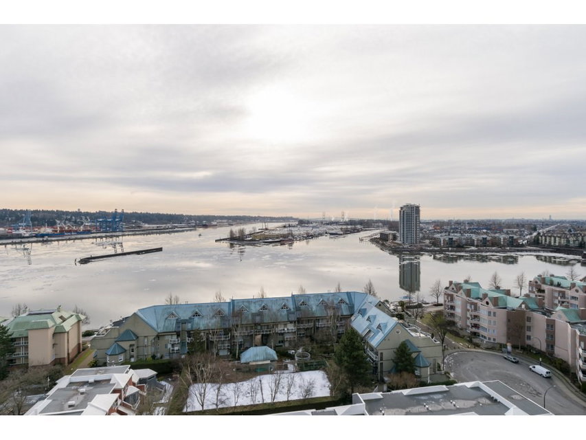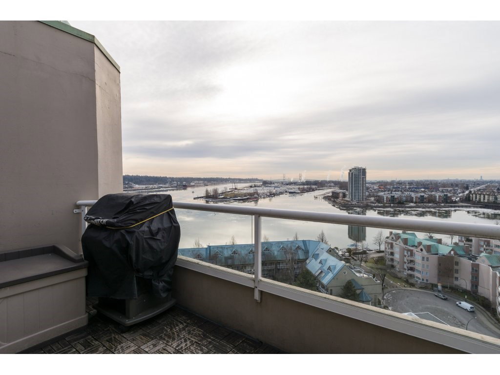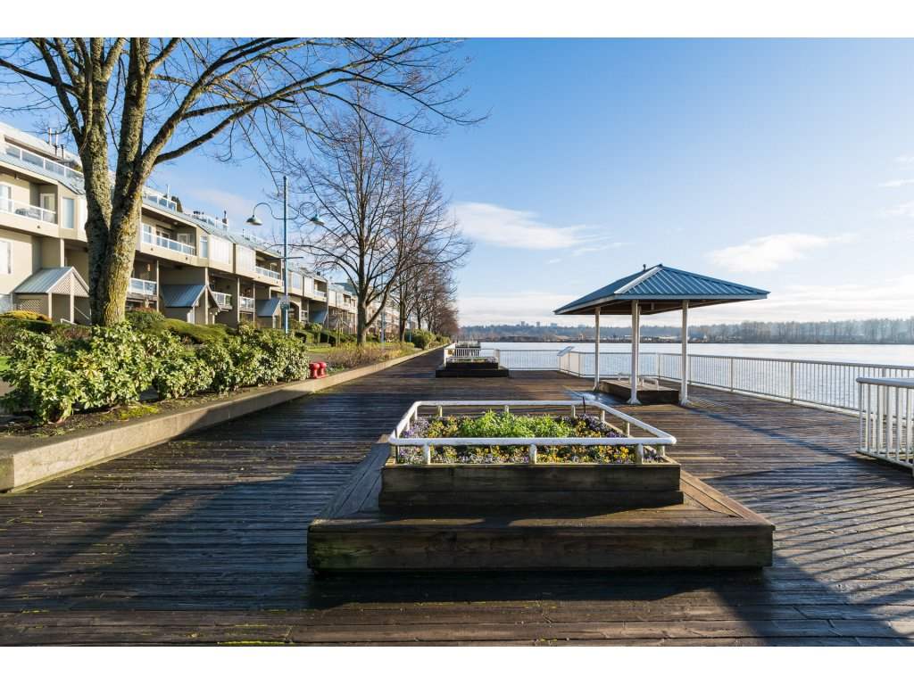 I love this condo. Overlooking the mighty Fraser River this bright and tastefully updated one bedroom and large den /bedroom sub penthouse is where you will want to call home. Quality laminate floors throughout living room, dining room and kitchen. White cabinetry, granite counters, undermount lights, high end stainless steel appliances. Breakfast bar completes the kitchen. Spacious master bedroom with four piece ensuite and built-ins in closet. Two piece guest bath as well. Entire building has just been re-piped. New deck flooring. This building DOES NOT allow rentals or pets. One parking and one locker.
