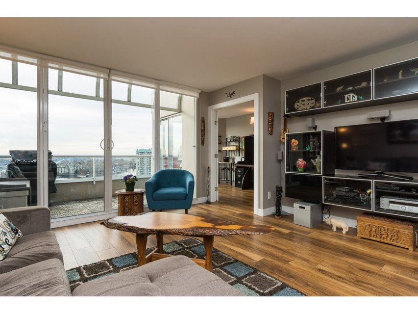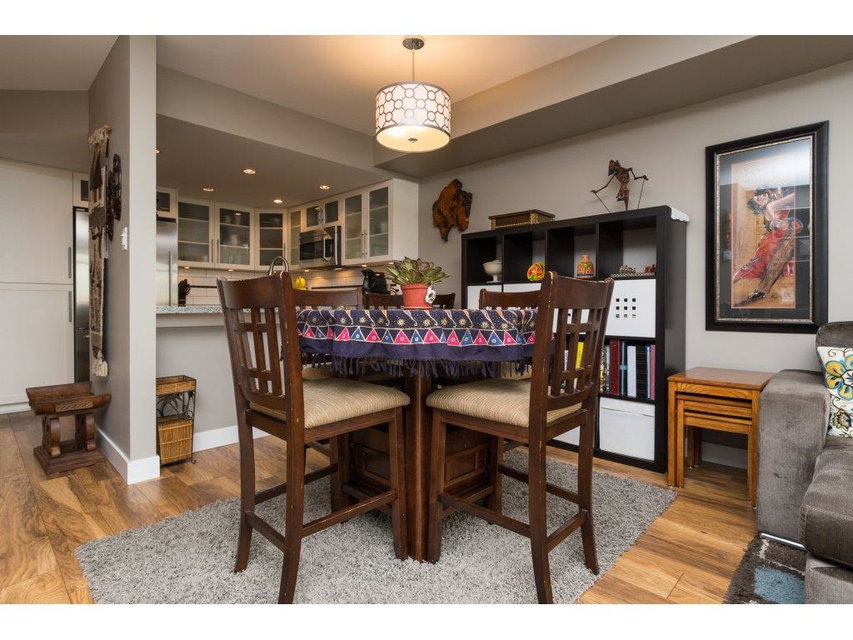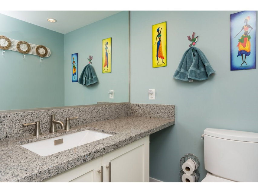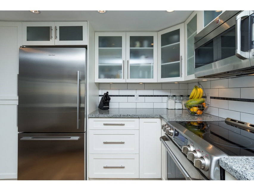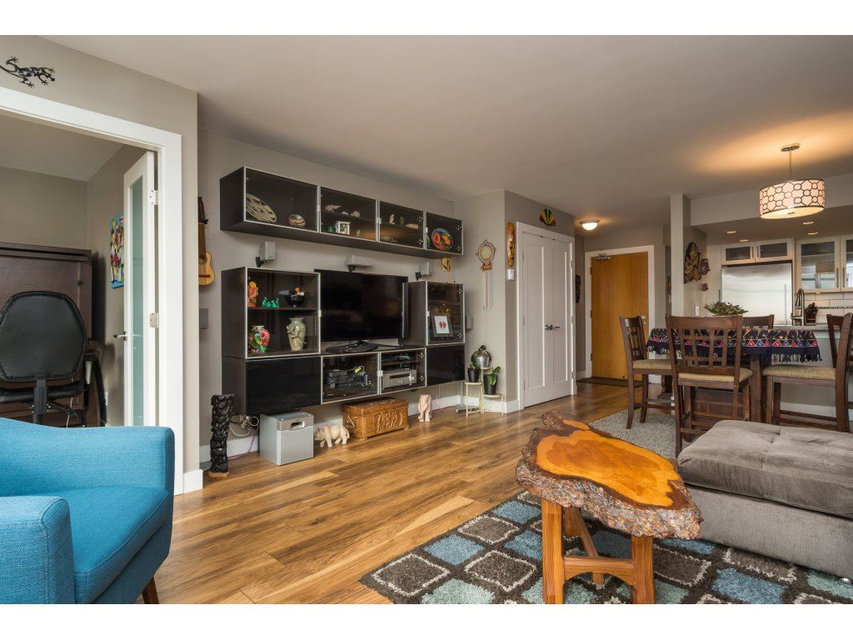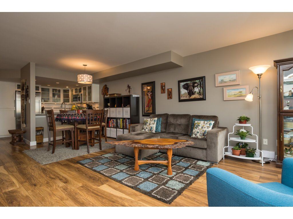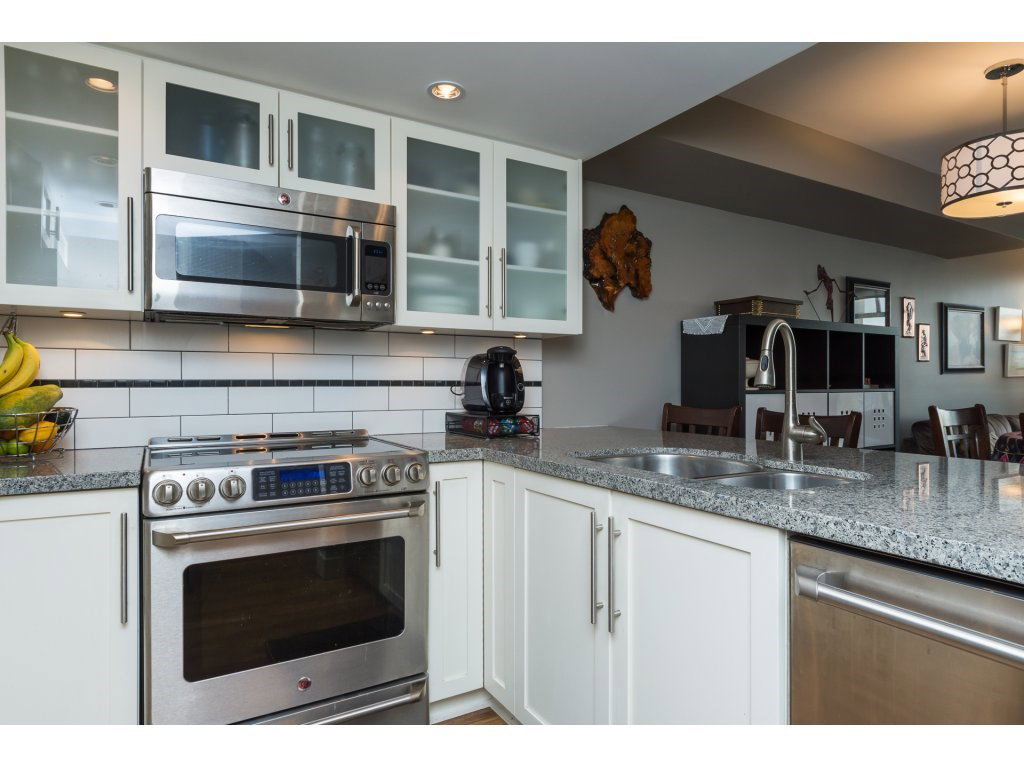 I love this condo. Overlooking the mighty Fraser River this bright and tastefully updated one bedroom and large den /bedroom sub penthouse is where you will want to call home. Quality laminate floors throughout living room, dining room and kitchen. White cabinetry, granite counters, undermount lights, high end stainless steel appliances. Breakfast bar completes the kitchen. Spacious master bedroom with four piece ensuite and built-ins in closet. Two piece guest bath as well. Entire building has just been re-piped. New deck flooring. This building DOES NOT allow rentals or pets. One parking and one locker.