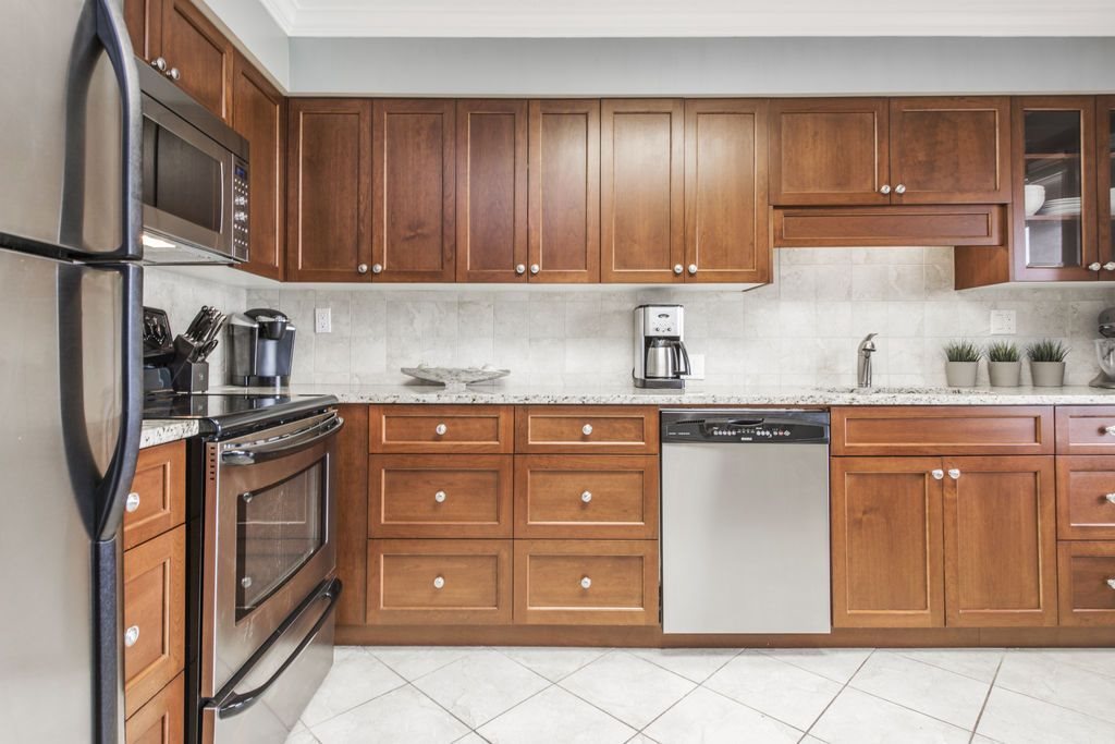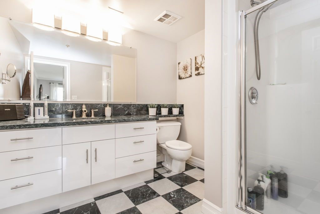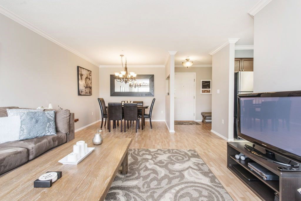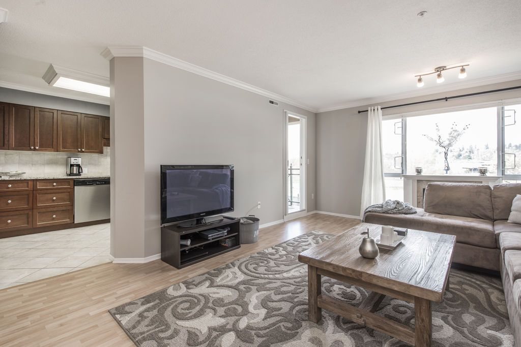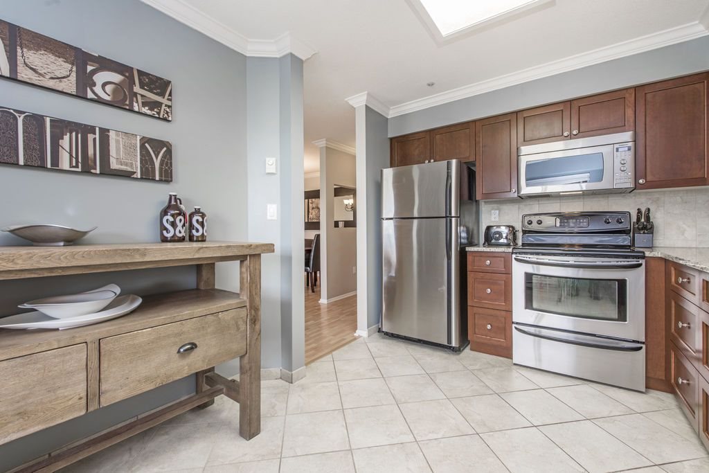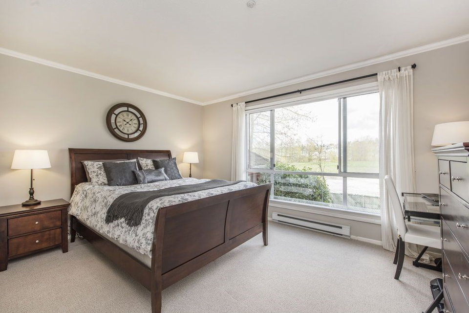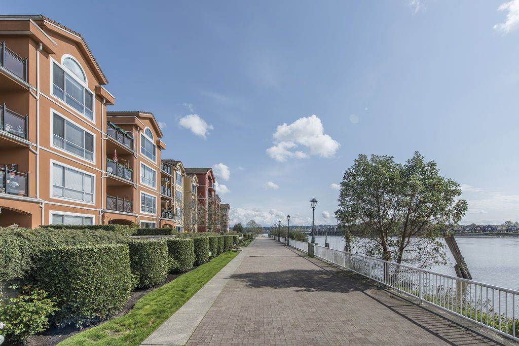Stunning, move in ready condo on the Quay. This spacious 2 bedroom, 2 bathroom 1,213 sq ft suite stretches across the face of the building offering plenty of big windows pouring light into every room. West exposure keeps cool on sunny days & offers expansive views of greenery with no neighbouring buildings. Kitchen features stainless appliances, granite countertop and cherrywood cabinets. Tastefully renovated bathrooms, all updated flooring & light fixtures; professionally painted and crown mouldings throughout, plus very clever bottom-up blinds. Rainscreened 1998, re-piped 2001, ext paint 2014. Just steps to the board walk, dog park and shuttle to Skytrain.