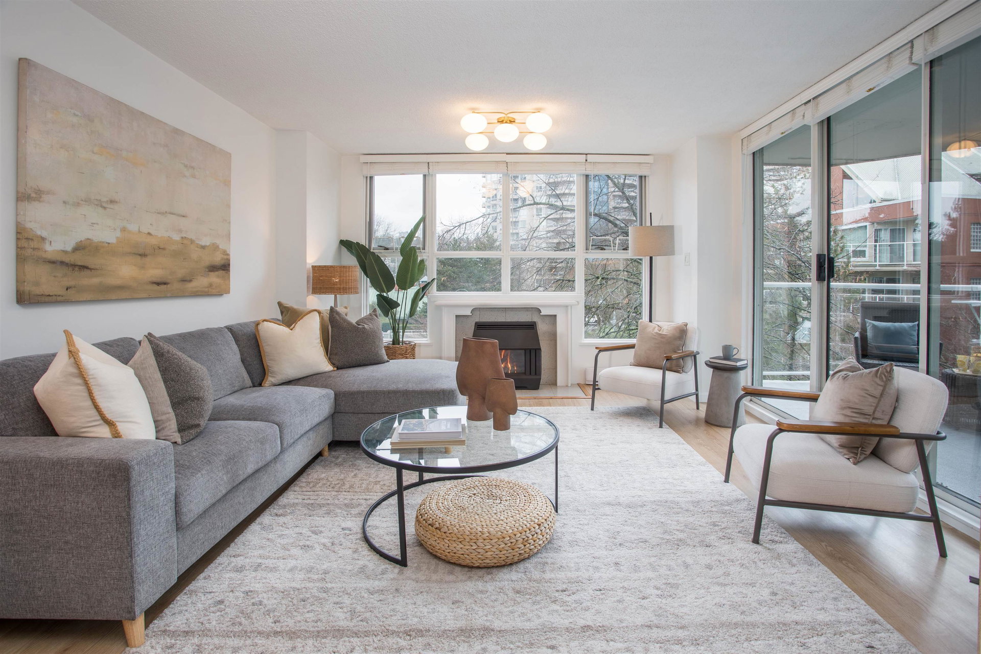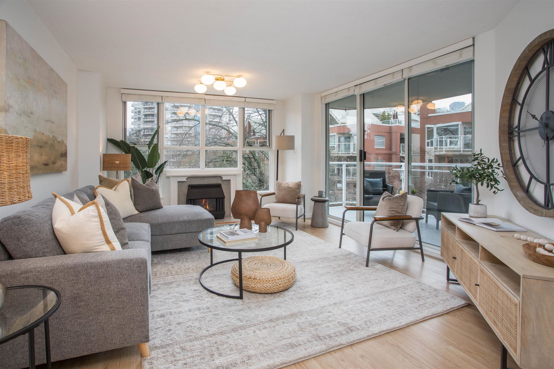 Riverfront lifestyle with the boardwalk right outside your door. 1,206 sq foot, spacious two bedroom, two bathroom home at the Promenade on the New West Quay. Bright corner unit soaked in natural light. Spread out your cozy furniture and warm up by the fireplace. Large primary bedroom might be your private oasis or quiet work from home space. Self care available in the amenities room: Sauna, hot tub, pool and gym. Or tire out the kids with a swim after a visit to the playground next door. Trusted, proactive strata, overseeing a reliable fully rainscreened tower featuring updated elevators and plumbing. Peace of mind for a move in ready home.