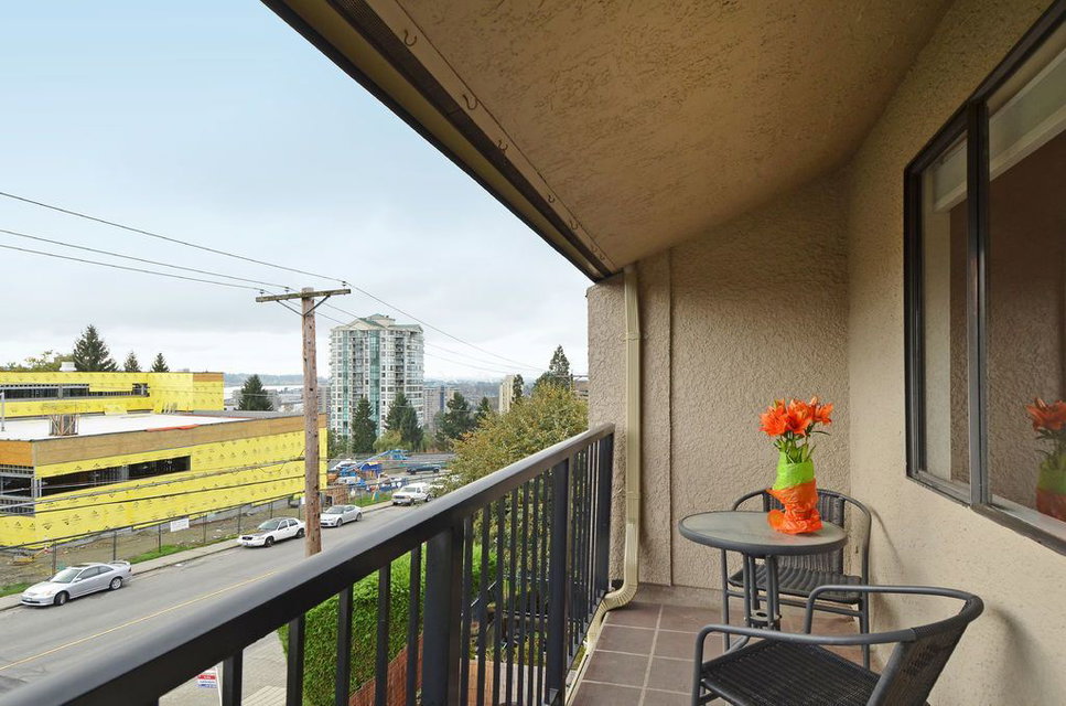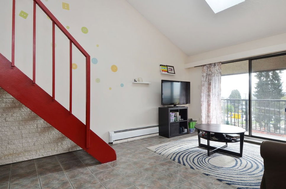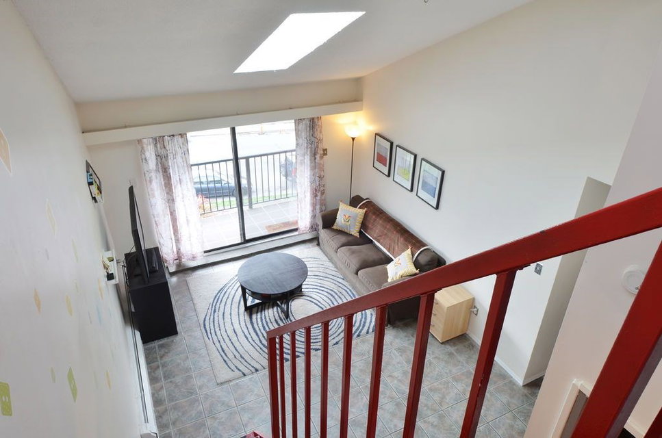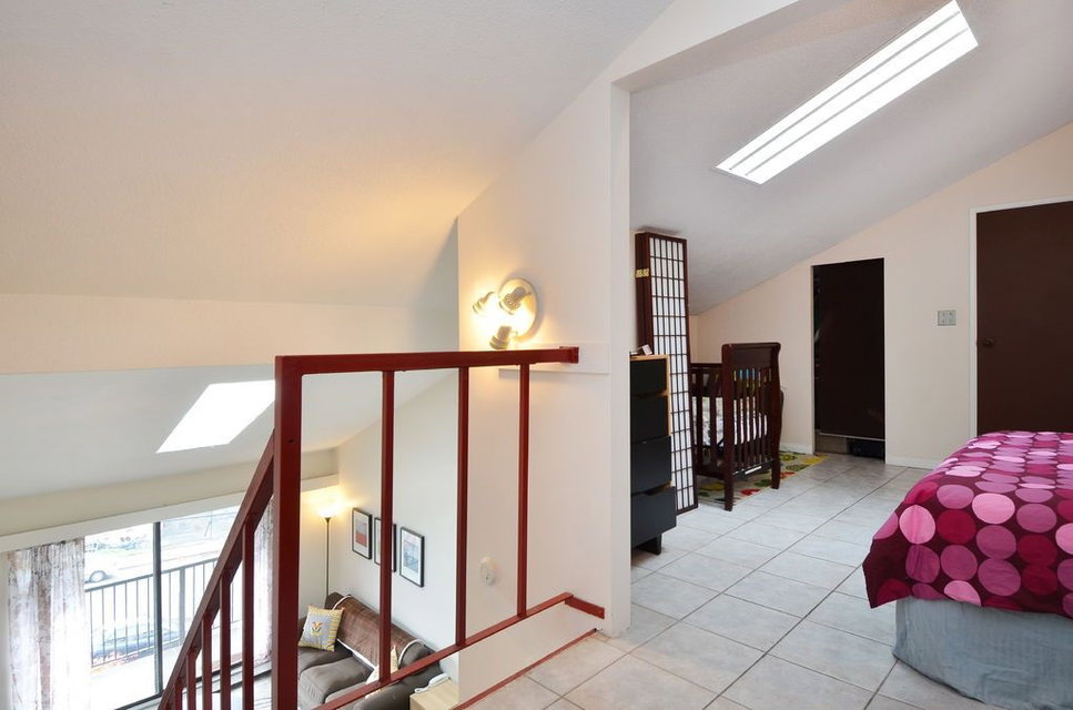Top floor loft with sunny exposure and SE views. Perched on the top of the bright, unobstructed side of the building. The skylights and vaulted ceilings open up the living space. 1 bedroom and full bathroom on the main floor. Loft is very spacious with a half bath and space to add a wall to create an office or den. Peace of mind. Building updates include: Raincreen, Balconies & Parking Membrane 2003, Plumbing & Boiler 2006, Roof 2011. Central, convenient location. New middle school across the street to be ready for fall 2016. Less than 10 minute walk to New West Skytrain and all the surrounding shops.